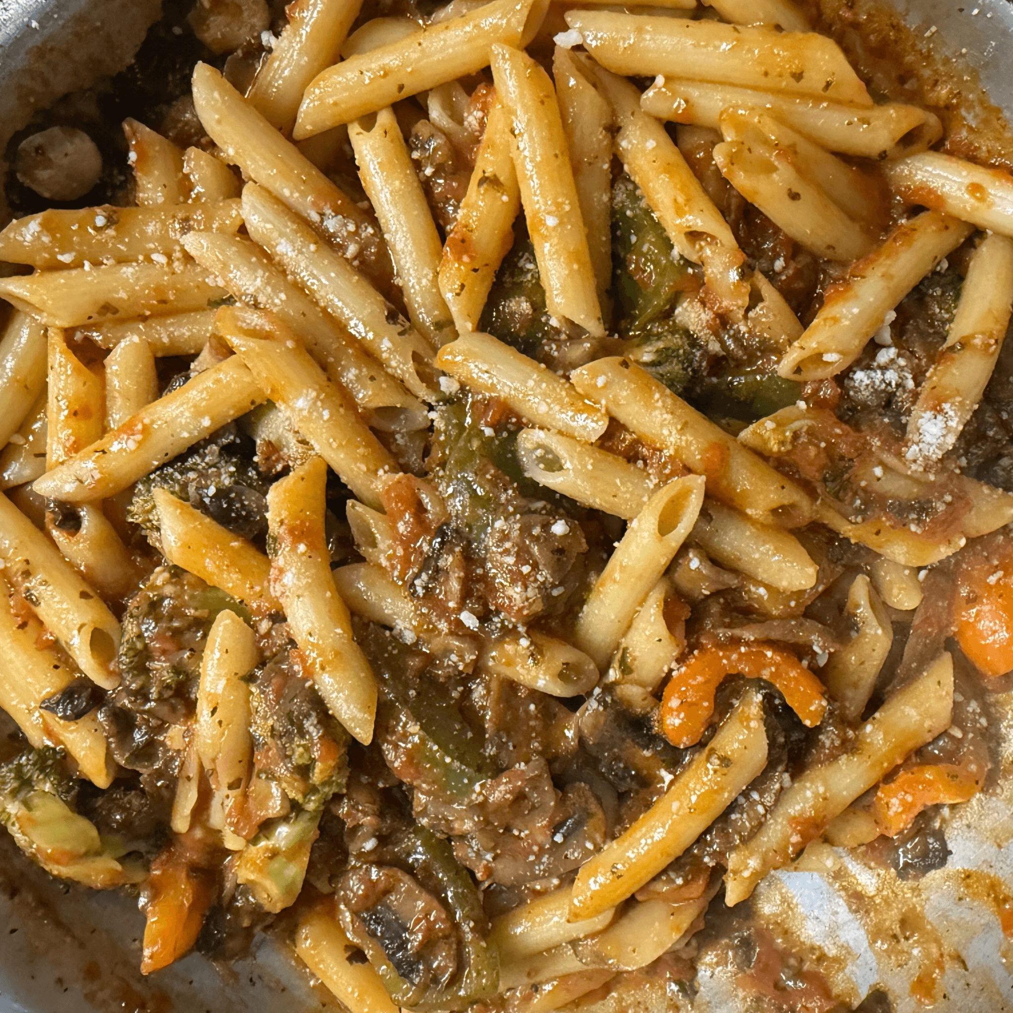 Baked penne with meat sauce, ricotta, and melted mozzarella.