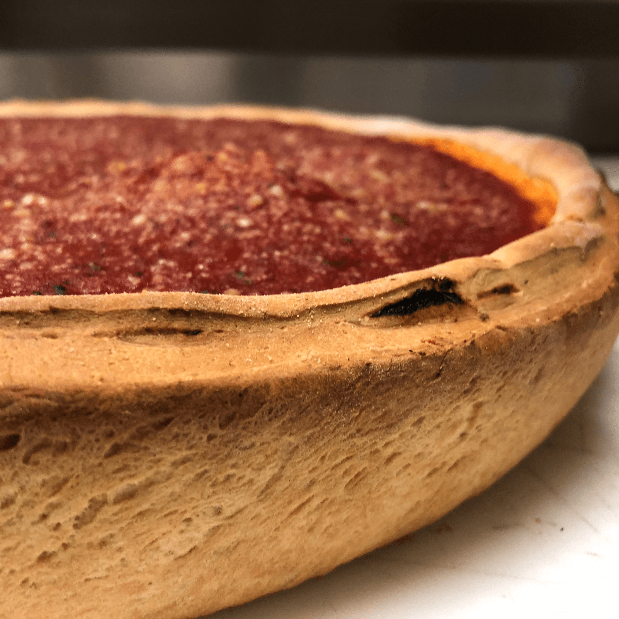 Thick crust with ingredients and cheese stuffed in the pizza and sauce on top
