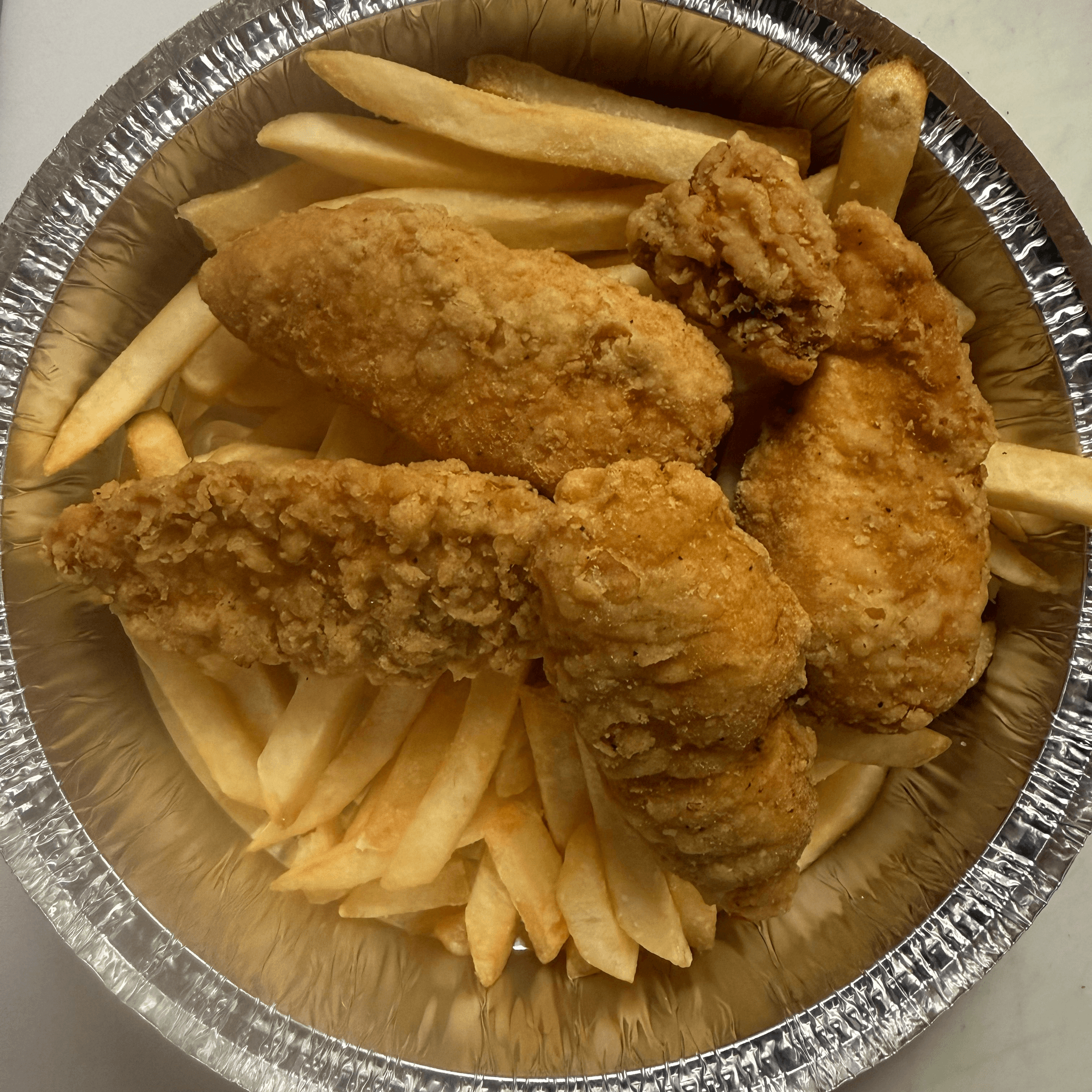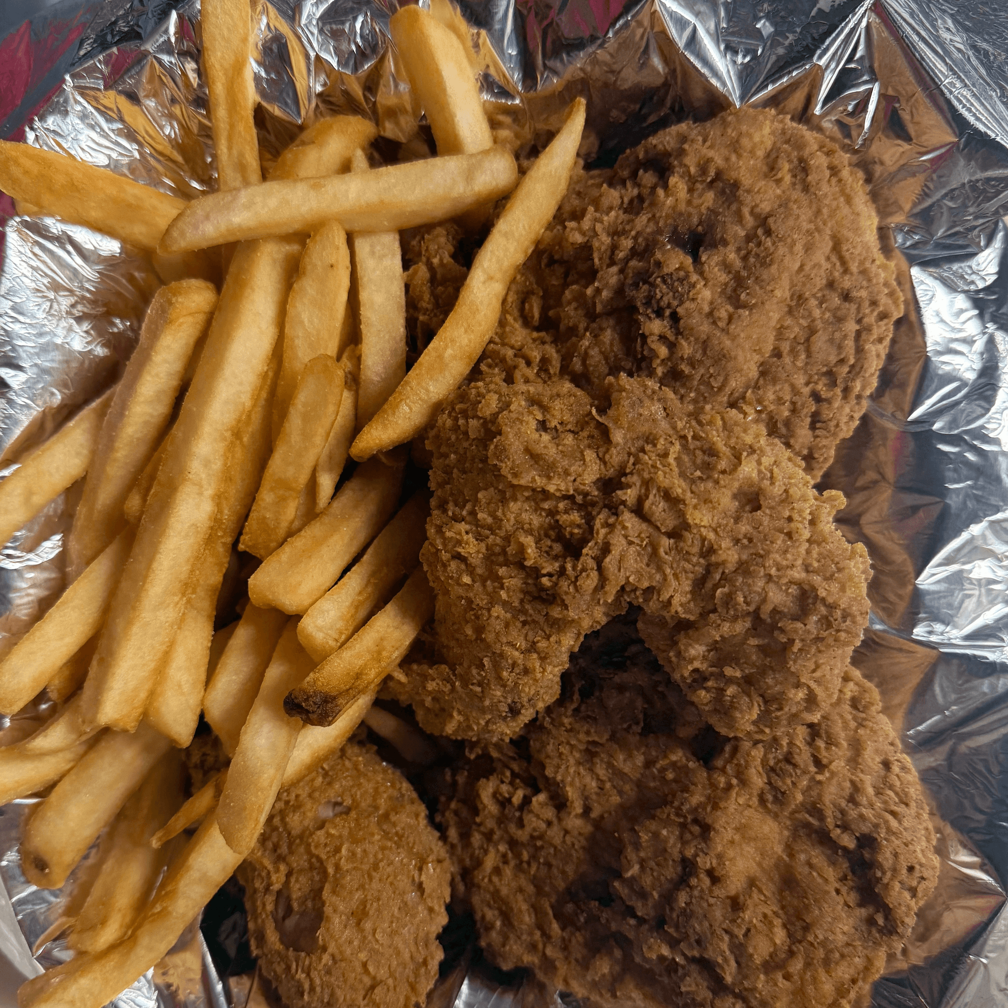 Breaded breast with buffalo sauce, ranch, lettuce, tomato and pickles. Served with fries.