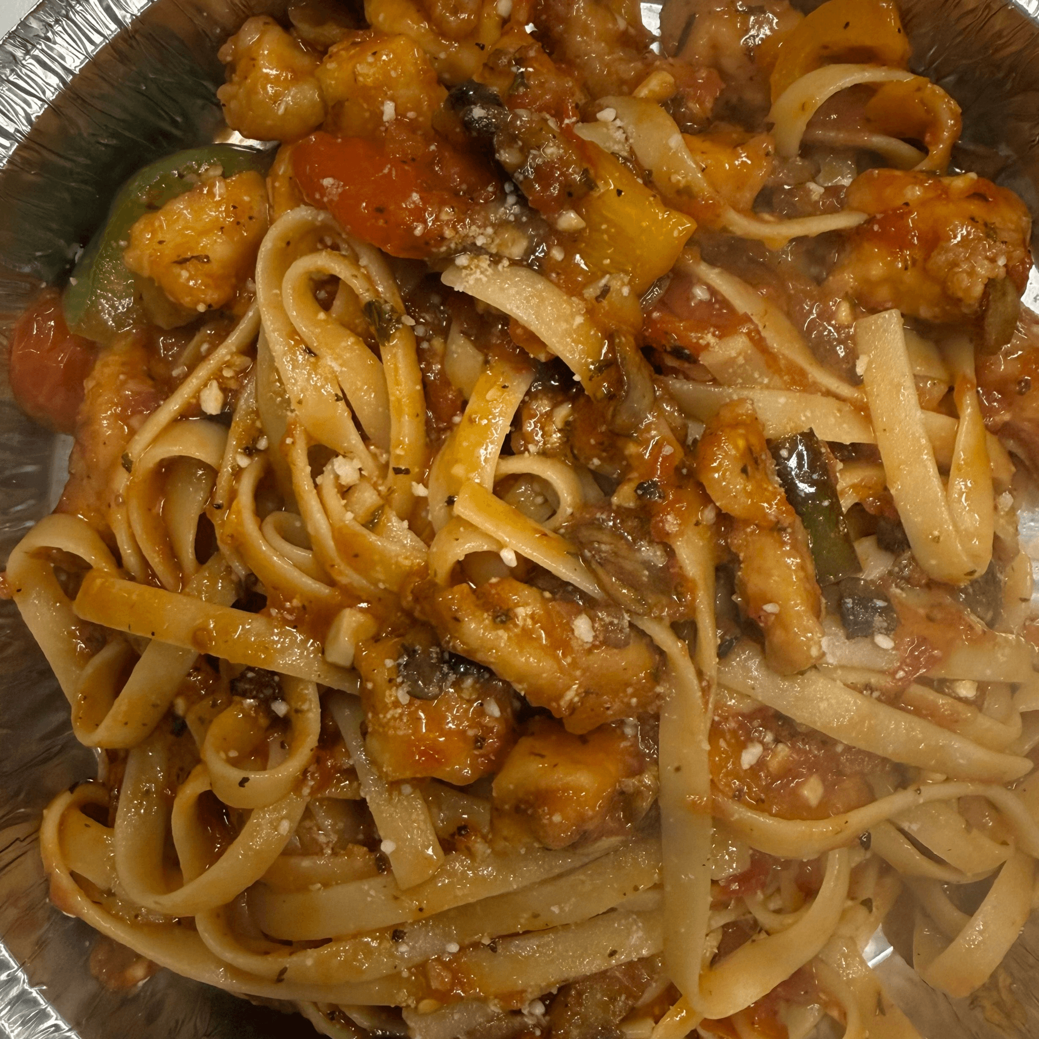 Fettuccine sautéed with garlic and oil. Chicken breast, tomato, peppers, and mushrooms.