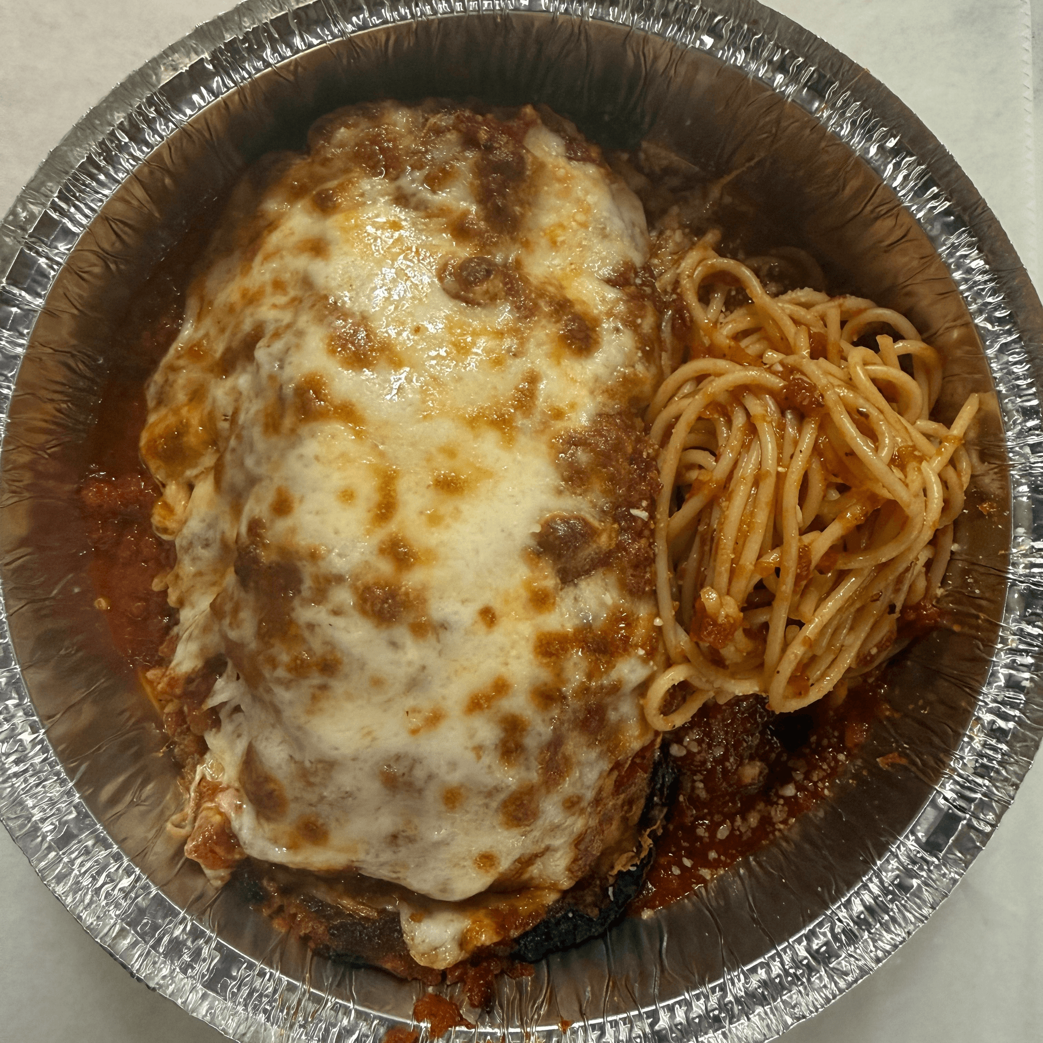 Sliced eggplant baked in meat sauce and melted mozzarella with side spaghetti.